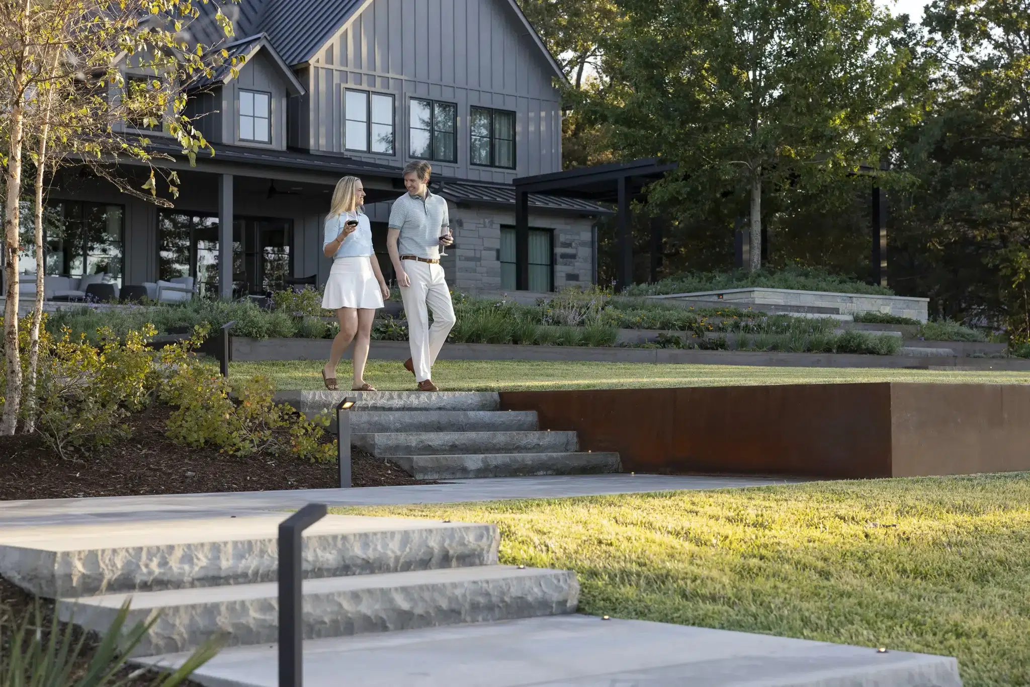 Patios and terraces define circulation and establish structure within the landscape. Thoughtful layout and material selection create seamless transitions between indoor and outdoor environments.