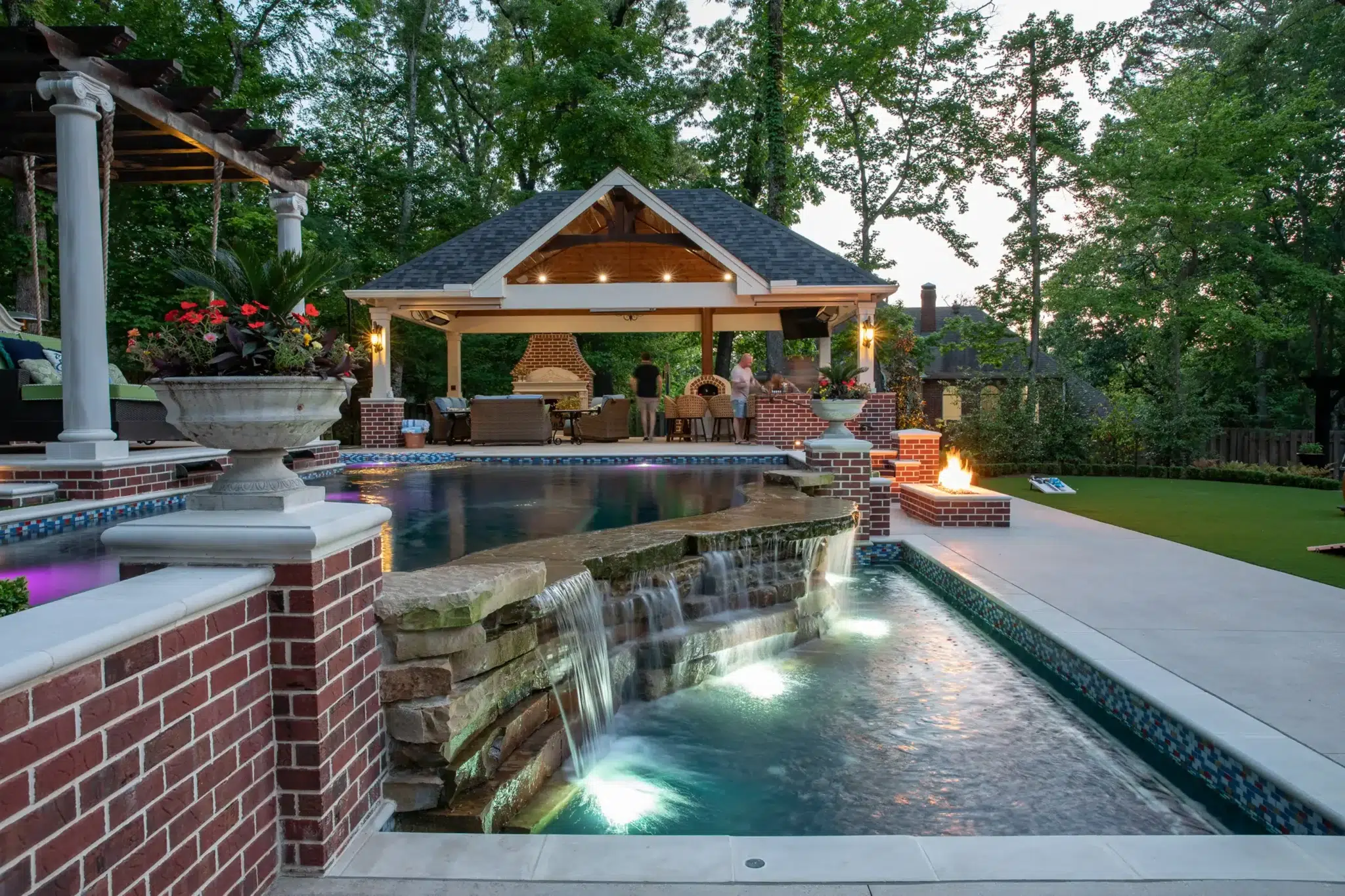 At the heart of the design is a meticulously detailed pool that becomes the visual and social center of the yard. It’s framed by the covered living zone and play lawn, allowing seamless transitions between swim, fun, and film-night under the stars. This integration of aesthetics and utility captures Landvisions’ commitment to landscapes that support vibrant, lasting memories.